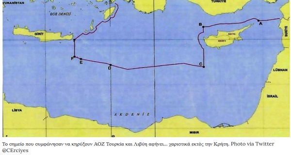 «Εγείροντας τις αξιώσεις της η Άγκυρα παραπέμπει σε συμφωνία που υπέγραψε στα τέλη του 2019 ο πρόεδρος Ερντογάν με τον λίβυο πρωθυπουργό Σάρατζ. Με τη συμφωνία οι δυο μοίρασαν μεταξύ τους έναν θαλάσσιο διάδρομο μεταξύ των τουρκικών και των λιβυκών ακτών, αδιαφορώντας για τα ελληνικά νησιά που βρίσκονται εντός αυτού. Με τον τρόπο αυτό η Τουρκία οικειοποιήθηκε περιοχές, οι οποίες βάσει τους διεθνούς δικαίου της θάλασσας ανήκουν την Αποκλειστική Οικονομική Ζώνη της Ελλάδας. ΕΕ και ΗΠΑ θεωρούν ότι η τουρκο-λιβυκή συμφωνία παραβιάζει το διεθνές δίκαιο.