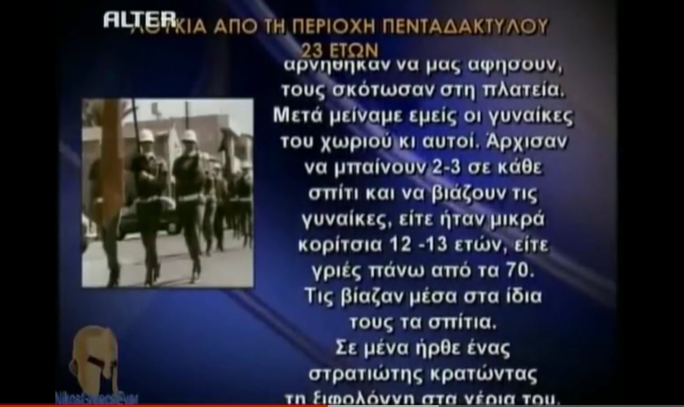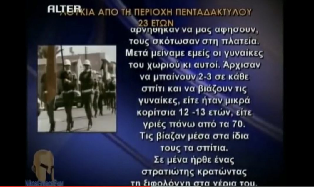 «Μπήκαν μέσα στο σπίτι, έβγαλαν με τη βία έξω τον άντρα και τα μικρά μου παιδιά. Τα παιδιά προσπαθούσαν να έρθουν στην αγκαλιά μου και αυτοί τα κλωτσαγαν και τα κοπάναγαν με τα όπλα. Ο τούρκος αξιωματικός με έβαλε μέσα στο σπίτι, με χτύπησε με το όπλο και άρχισε να μου σκίζει τα ρούχα. Κάποια στιγμή κατάφερα να ξεφύγω και έτρεξα γυμνή στην αυλή, εκεί που ήταν ακόμα ο άντρας και τα παιδιά μου υπό την απειλή των όπλων. Ο τούρκος αξιωματικός με πρόλαβε και με βίασε μπροστά στα μάτια του άντρα μου και των παιδιών μου».