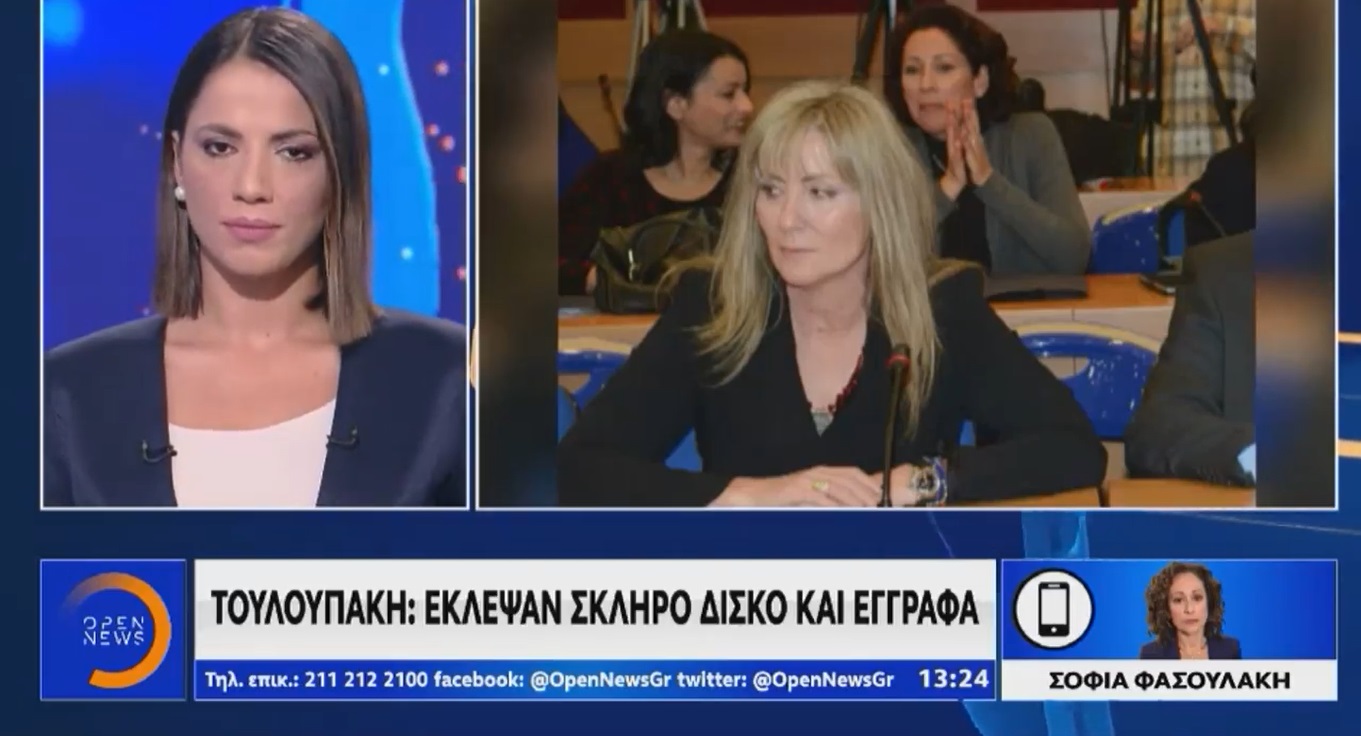 Σήμερα αναμένεται το απόγευμα συμπληρωματική κατάθεση της εισαγγελέως Ελένης Τουλουπάκη στην αστυνομία για την διαρρηξη στο σπίτι της με νεώτερα στοιχεία. Όπως μετέδωσε το μεσημβρινό δελτίο του OPEN, από σπίτι της εκλάπησαν, ένας φορητός υπολογιστής, ένας σκληρός δίσκος που είχε πάνω στο γραφείο της, κάποια έγγραφα και κάποια στικάκια USB. Εντύπωση προκαλεί το γεγονός ότι η οικία της δεν φυλασσόταν από το υπηρεσιακό αυτοκίνητο που θα έπρεπε να ήταν στην θέση του όλο του 24ωρο. Ως προς τα τιμαλφή, δεν εκλάπησαν κοσμήματα, ούτε ακόμη και το ακριβό ρολόι που είχε αφήσει πάνω στο γραφείο της.