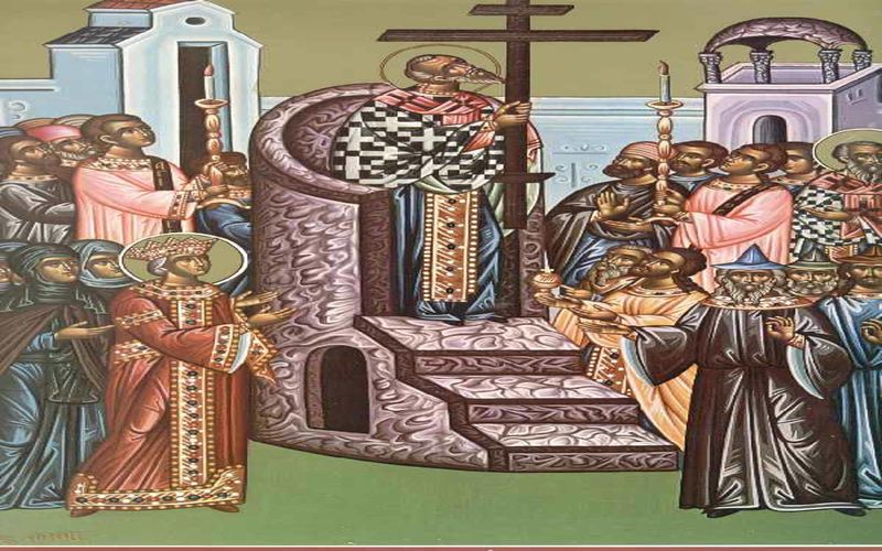 Το έτος 326 η Αγία Ελένη πήγε στην Ιερουσαλήμ για να προσκυνήσει τους Αγίους Τόπους και να ευχαριστήσει το Θεό για τους θριάμβους του γιου της, Μ. Κωνσταντίνου. Ο Θείος ζήλος όμως, έκανε την Άγία Ελένη να αρχίσει έρευνες για την ανεύρεση του Τιμίου Σταυρού. Επάνω στο Γολγοθά υπήρχε ειδωλολατρικός ναός της θεάς Αφροδίτης, τον οποίο γκρέμισε και άρχισε τις ανασκαφές. Σε κάποιο σημείο, βρέθηκαν τρεις σταυροί. Η συγκίνηση υπήρξε μεγάλη, αλλά ποιός από τους τρεις ήταν του Κυρίου; Τότε ο επίσκοπος Ιεροσολύμων Μακάριος με αρκετούς Ιερείς, αφού έκανε δέηση, άγγιξε στους σταυρούς το σώμα μιας ευσεβέστατης κυρίας που είχε πεθάνει. Όταν ήλθε η σειρά και άγγιξε τον τρίτο σταυρό, που ήταν πραγματικά του Κυρίου, η γυναίκα αμέσως αναστήθηκε. Η είδηση διαδόθηκε σαν αστραπή σε όλα τα μέρη της Ιερουσαλήμ. Πλήθη πιστών άρχισαν να συρρέουν για να αγγίξουν το τίμιο ξύλο. Επειδή, όμως, συνέβησαν πολλά δυστυχήματα από το συνωστισμό, ύψωσαν τον Τίμιο Σταυρό μέσα στο ναό σε μέρος υψηλό, για να μπορέσουν να τον δουν και να τον προσκυνήσουν όλοι. Αυτή, λοιπόν, την ύψωση καθιέρωσαν οι άγιοι Πατέρες, να γιορτάζουμε στις 14 Σεπτεμβρίου, για να μπορέσουμε κι εμείς να υψώσουμε μέσα στις ψυχές μας το Σταυρό του Κυρίου μας, που αποτελείτο κατ’ εξοχήν “όπλον κατά του διαβόλου”. (Ορισμένοι Συναξαριστές, αυτή την ημέρα, αναφέρουν και την ύψωση του Τιμίου Σταυρού στην Κωνσταντινούπολη το 628 από τον βασιλιά Ηράκλειο, που είχε νικήσει και ξαναπήρε τον Τίμιο Σταυρό από τους Αβάρους, οι οποίοι τον είχαν αρπάξει από τους Αγίους Τόπους).