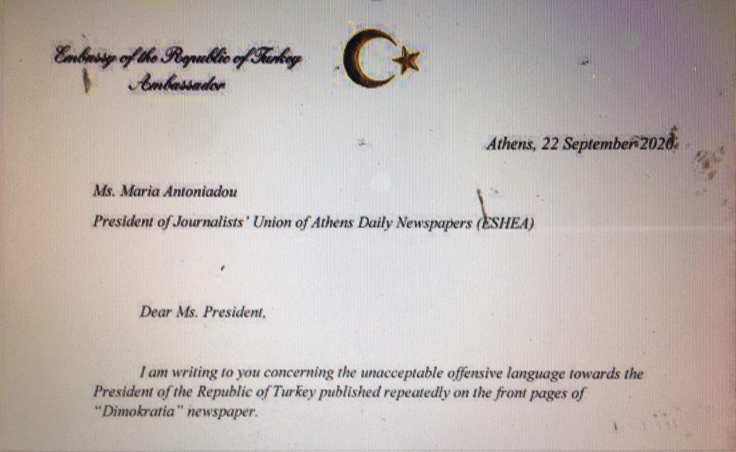 Αργά το μεσημέρι της Παρασκευής (25/09) στην γραμματεία της Ένωσης Συντακτών Ημερησίων Εφημερίδων Αθηνών, παραδόθηκε κλειστός φάκελος με εσωκλειόμενη επιστολή που φέρει την υπογραφή του Τούρκου Πρέσβη Β.Ozngergin.