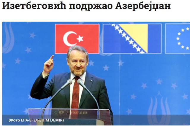 Ο Πρόεδρος του Κόμματος Δημοκρατικής Δράσης (SDA) της Βοσνίας- Ερζεγοβίνης και Αντιπρόεδρος της Κοινοβουλευτικής Συνέλευσης, Μπακίρ Ιζετμπέγκοβιτς, τάχθηκε στο πλευρό της Τουρκίας, δηλώνοντας ότι η Αρμενία φέρει «πλήρη ευθύνη για την έξαρση της σύγκρουσης στο Αζερμπαϊτζάν», υποστηρίζοντας έτσι άμεσα το Αζερμπαϊτζάν στη σύγκρουση στην περιοχή Ναγκόρνο-Καραμπάχ, όπως αναφέρει το σερβικό ειδησεογραφικό πρακτορείο Tanjug. Μιλάμε για τον ισλαμιστή που κατάγεται από οικογένεια συνεργατών των ναζί και υπευθύνων για μεγάλες σφαγές κατά του σερβικού και εβραϊκού πληθυσμού της Γιουγκοσλαβίας. Λογικό ήταν να πάρει το μέρος των σφαγέων Τουρκίας και Αζερμπαϊτζάν!