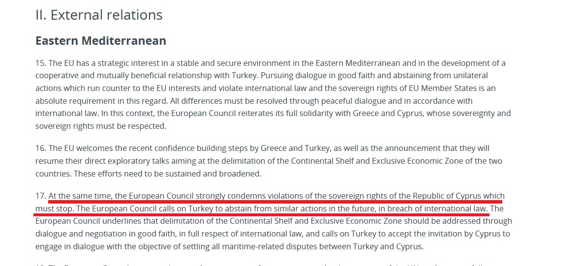 Ταυτόχρονα, το Ευρωπαϊκό Συμβούλιο καταδικάζει έντονα τις παραβιάσεις των κυριαρχικών δικαιωμάτων της Κυπριακής Δημοκρατίας και διατρανώνει ότι πρέπει να σταματήσουν. Το Ευρωπαϊκό Συμβούλιο καλεί την Τουρκία να απέχει από παρόμοιες ενέργειες στο μέλλον, καθώς αποτελούν παραβίαση του διεθνούς δικαίου, ενώ υπογραμμίζει ότι η οριοθέτηση της υφαλοκρηπίδας και της Αποκλειστικής Οικονομικής Ζώνης πρέπει να αντιμετωπιστεί μέσω διαλόγου και διαπραγματεύσεων με καλή πίστη, με πλήρη σεβασμό του διεθνούς δικαίου. Καλεί την Τουρκία να αποδεχτεί την πρόσκληση της Κύπρου για την έναρξη διαλόγου με σκοπό την επίλυση όλων των θαλάσσιων διαφορών μεταξύ Τουρκίας και Κύπρου….