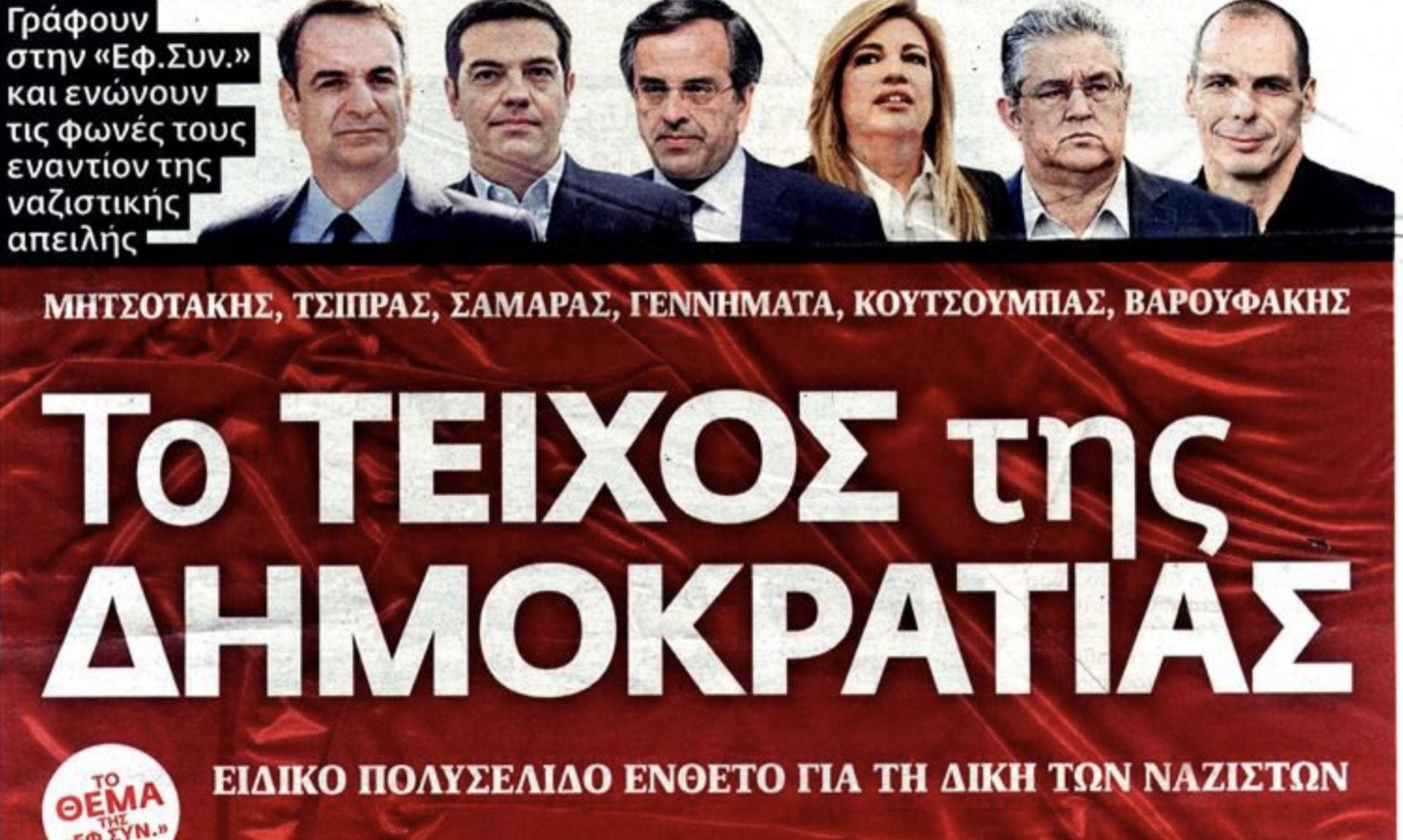 Με πρόσχημα την δίκη της Χρυσής Αυγής η Εφημερίδα των Συντακτών αγκαλιάζει στοργικά μεγάλους δημοκράτες όπως ο Αντώνης Σαμαράς και ο Κυριάκος Μητσοτάκης. Που φυσικά τα παιδιά δεν έχουν σε καμμιά περίπτωση κοινό χορηγό με την Χρυσή Αυγή.