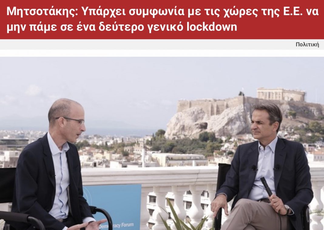 Ο Έλληνας πρωθυπουργός κρεμάει την επιτροπή που υπάρχει και υποτίθεται αποφασίζει για τα μέτρα του Κορωνοϊού. Δηλωνει ξεκάθαρα πως υπάρχει συμφωνία με τις χώρες της Ευρωπαϊκής Ενωσης να μην πάμε σε νέο lockdown.
