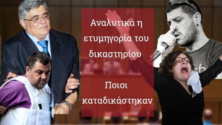 Έτσι επτά πρώην βουλευτές της κρίθηκαν ένοχοι για διεύθυνση εγκληματικής οργάνωσης, οι Νίκοσ Μιχαλολιάκος, Ηλίασ Κασιδιάρης, Ιωάννησ Λαγός, Γιώργος Γερμενής, Ηλίας Παναγιώταροσ, Αρτέμης Ματθαιόπουλος.