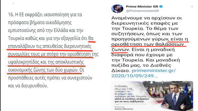 Στα συμπεράσματα της συνόδου κορυφής της 1ης Οκτ. 2020, αναφέρεται ρητά και ξεκάθαρα, πως οι διερευνητικές συνομιλίες έχουν στόχο την οριοθέτηση της υφαλοκρηπίδας και της αποκλειστικής οικονομικής ζώνης των δύο χωρών…