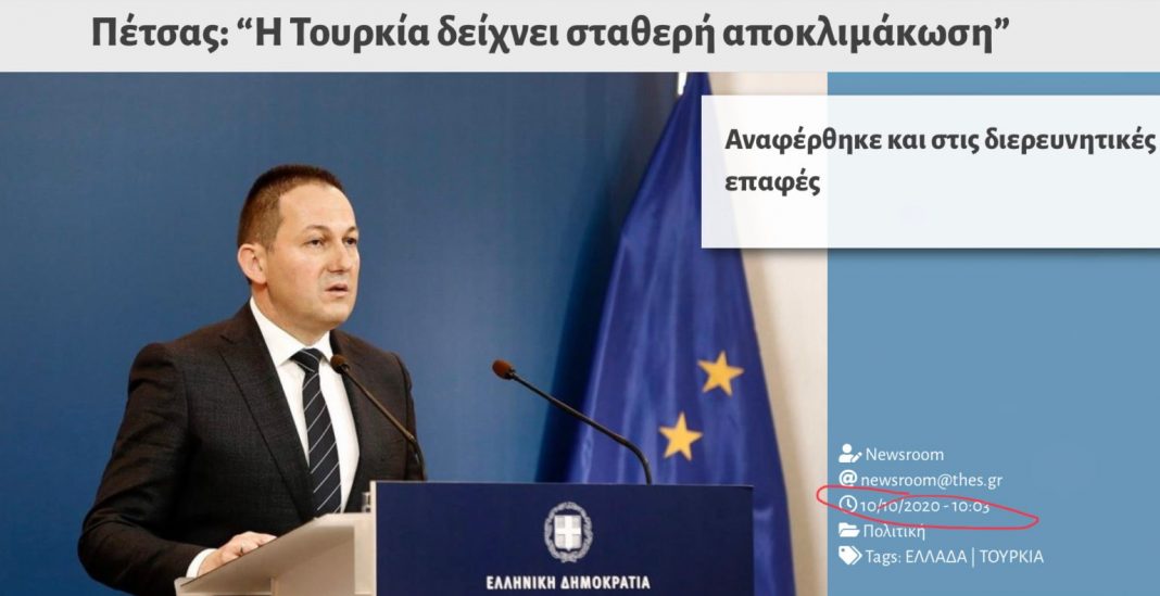 Η Τουρκια δείχνει σταθερή αποκλιμάκωση. Αυτά ήταν τα λόγια του Στέλιου Πετσα λίγες μόνο ώρες πριν την πρωτοφανή πρόκληση της Τουρκίας με την εισβολή του ερευνητικού σκάφους Oruc Reis στην ελληνική εθνική κυριαρχία, λίγα μόλις μίλια από το Καστελλόριζο.