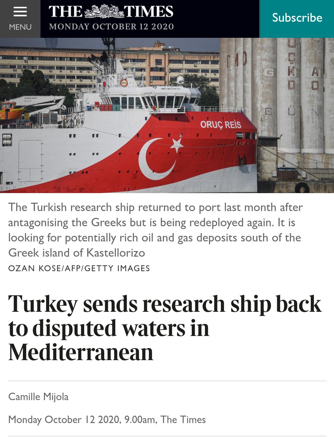 Πριν από λίγο χτύπησαν και οι Τάιμς, με ένα ελεεινό άρθρο στο οποίο ενώ διευκρινίζουν πως η Τουρκία στέλνει το ερευνητικό σκάφος νότια του Καστελόριζου, χαρακτηρίζει την συγκεκριμένη περιοχή διαφιλονικούμενη, κάνοντας μάλιστα λόγο για φιλονικία μεταξύ Τουρκίας, Ελλάδας και Κύπρου!