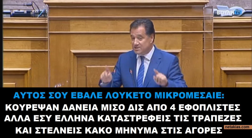Να μην πούμε για τα 300.000.000 θαλασσοδάνεια της Νέας Δημοκρατίας και να μην πούμε και τα 1.300.000 που χρωστάει ο Κυριάκος Μητσοτάκης. Κατά τον Αδωνη Γεωργιάδη αν δώσουμε 2.000 ευρώ σε έναν μικρομεσαίο για να σωθεί η επιχείρησή του θα οδηγήσεις σε bank run, σε capital control και θα δόσει λάθος μήνυμα στις Αγορές.