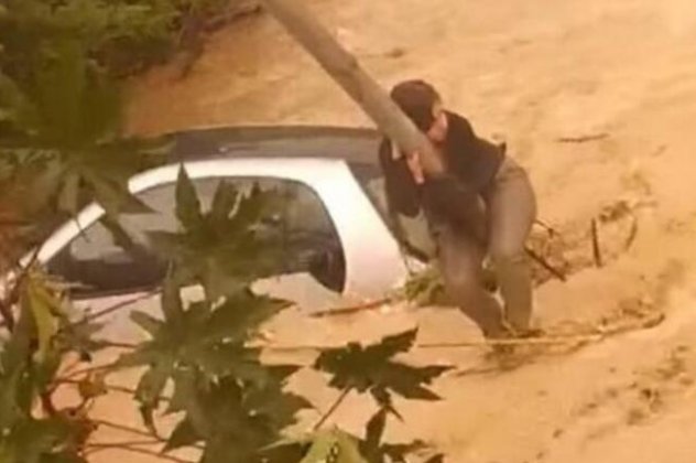 Η κοπελα κατόρθωσε να βγει από το αυτοκίνητό της και να σκαρφαλώσει σε έναν στύλο της ΔΕΗ, γιαν να μην παρασυρθεί από τον χείμαρρο που παράσερνε τα πάντα στο πέρασμα του.