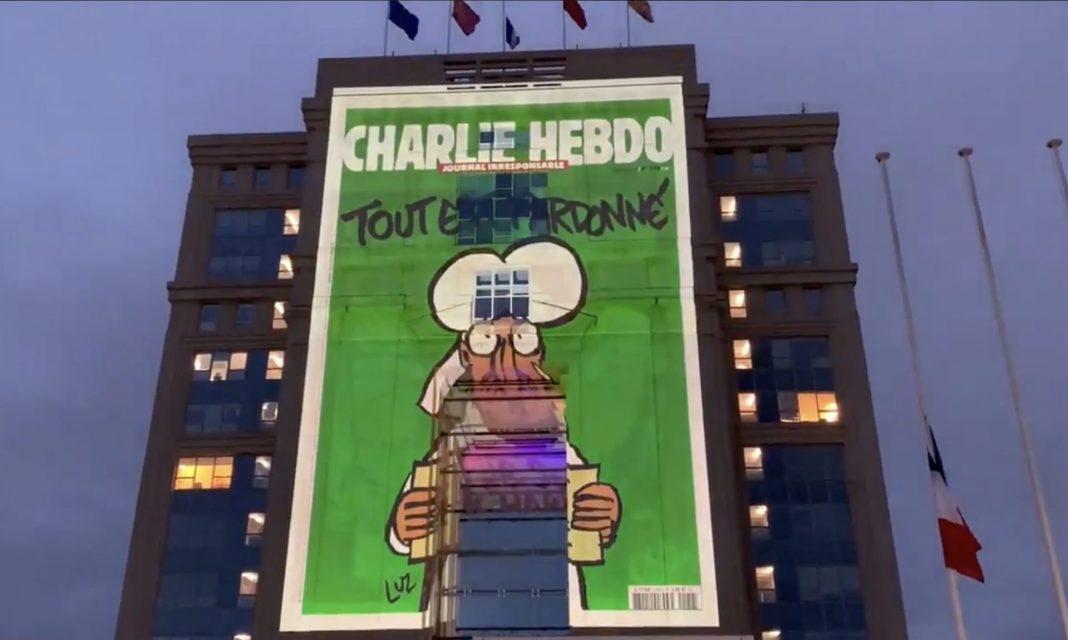 Οι Γάλλοι στέκονται στο πλευρό του Εμανουέλ Μακρόν και κηρύσσουν τον πόλεμο κατά του ισλαμισμού και της τρομοκρατίας! Σε γιγαντοοθόνες προβάλλονται τα σκίτσα του περιοδικού που έγιναν στόχος των ισλαμιστών δολοφόνων!