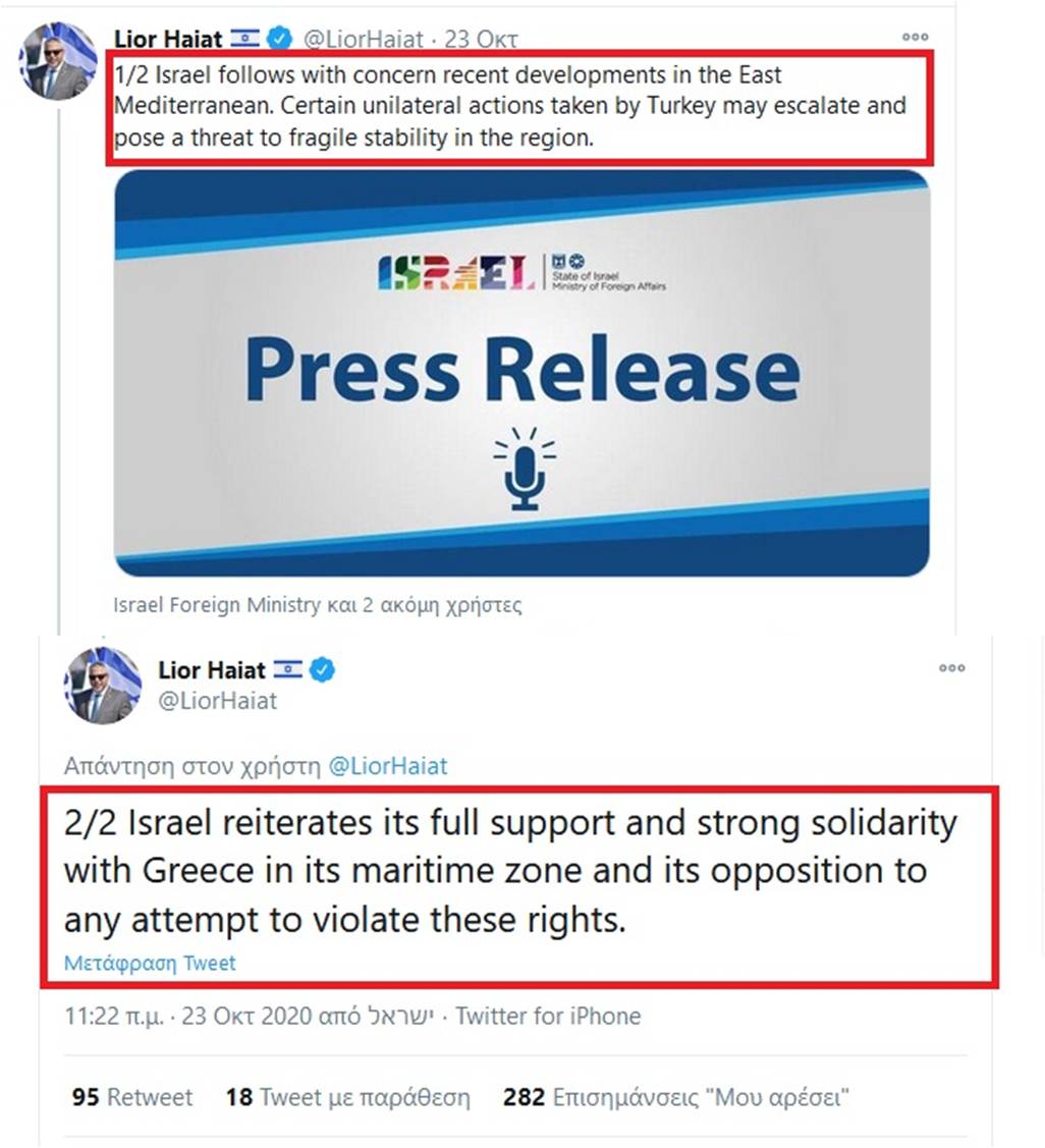 Σε Twitter του ο Lior Haiat, εκπρόσωπος τύπου του ΥΠΕΞ του Ισραήλ δημοσίευσε: «Το Ισραήλ παρακολουθεί τις τελευταίες εξελίξεις στην Ανατολική Μεσόγειο. Ορισμένα μονομερή μέτρα που έλαβε η Τουρκία θα μπορούσαν να υπονομεύσουν την εύθραυστη σταθερότητα στην περιοχή. ”