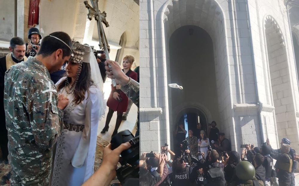 Παντρεύτηκε ακόμα και με τη στολή ένας Αρμένιος στρατιώτης στο Ναγκόρνο Καραμπάχ, ο οποίος βρισκόταν στο μέτωπο, έκανε… διάλειμμα για να παντρευτεί στον καθεδρικό του Σούσι που μερικές ημέρες πριν είχε γίνει στόχος των Αζέρων και τις επόμενες ώρες θα ξαναγυρίσει στο μέτωπο!