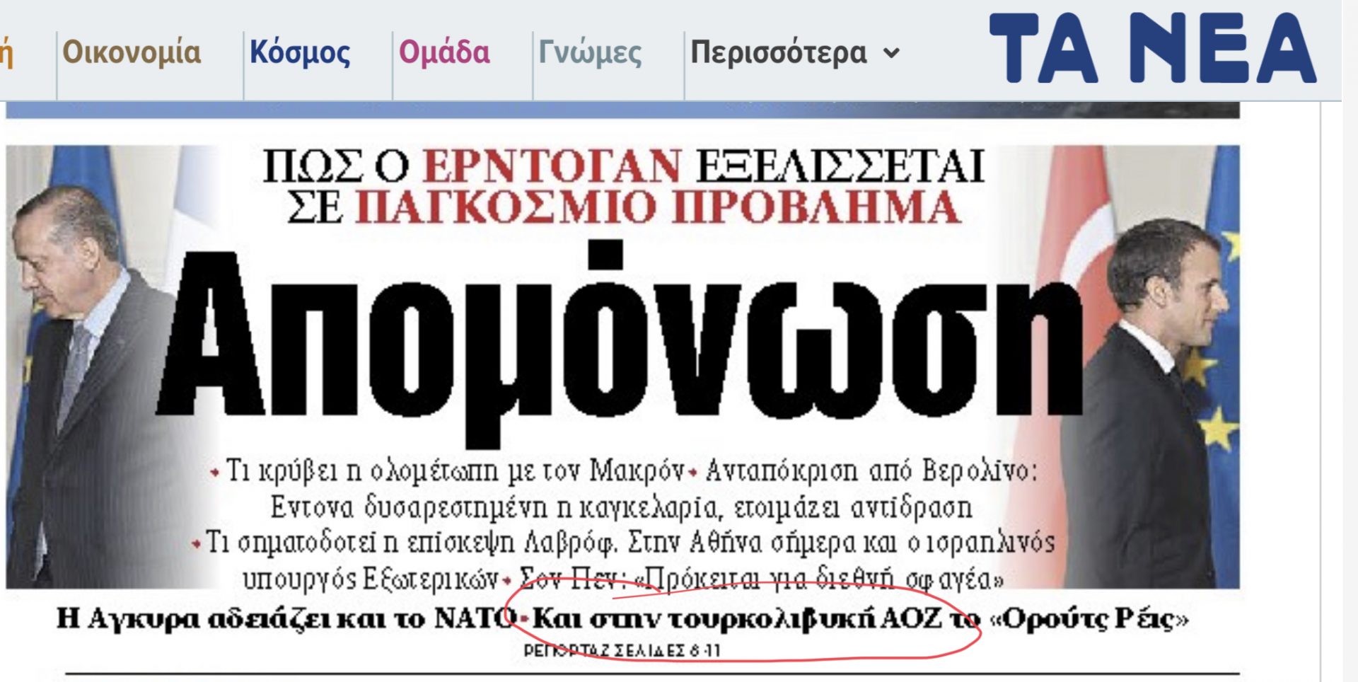 Αναμένουμε λοιπόν από την κυβέρνηση να καταδικάσει απερίφραστα αυτό το πρωτοσέλιδο. Το οποίο δίνει μίας πρώτης τάξεως υποστήριξη στις ανθελληνικές βλέψεις του Ερντογάν και της Τουρκίας. ΠρωτοσελιδαΕιδήσεις