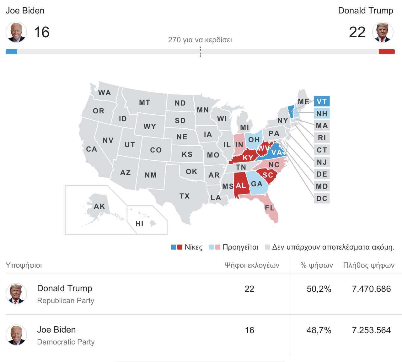 Στην βόρεια Καρολίνα όμως ο Τραμπ φαίνεται ότι έχει ακόμα ελπίδες, καθώς μειώνει σιγά-σιγά την διαφορά σχεδόν στη μία ποσοστιαία μονάδα. Στην Βιρτζίνια ο Τραμπ φαίνεται ότι θα κερδίσει άνετα την πολιτεία. Στην Βιρτζίνια μάλιστα ο τραμ κάνει μεγάλη έκπληξη ανατρέποντας μία πολιτεία που στις προηγούμενες εκλογές ανήκε στους δημοκρατικούς, ενώ η διαφορά που αυτή τη στιγμή είναι ιλιγγιώδης, στις 18 ποσοστιαίες μονάδες!