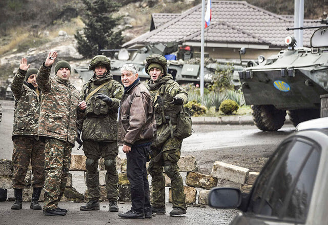 Ειρηνευτικές ρωσικές δυνάμεις στο δρόμο του Λατσίν- φωτό 13 Νοεμβρίου 2020Η ρωσική κυβέρνηση δημοσίευσε το πλήρες κείμενο της δήλωσης για την παύση του πολέμου στο Ναγκόρνο-Καραμπάχ, η οποία αναφέρεται σε σημεία παρόμοια με αυτά που έχουν ήδη συζητηθεί στις Συμφωνίες της Μαδρίτης του 2009, όταν η Ομάδα του Μινσκ προσπάθησε να επιλύσει τη σύγκρουση.Το πρώτο σημείο ανακοινώνει την πλήρη κατάπαυση του πυρός και την παύση όλων των εχθροπραξιών στη ζώνη σύγκρουσης Ναγκόρνο-Καραμπάχ. Αυτό σημαίνει επίσης ότι τόσο το Αζερμπαϊτζάν όσο και η Αρμενία σταματούν στις σημερινές θέσεις τους χωρίς να προχωρήσουν ή να υποχωρήσουν. Κατά τη διάρκεια του δεύτερου σημείου συμφωνήθηκε ότι η περιοχή του Άνταμ πρέπει να επιστραφεί στο Αζερμπαϊτζάν πριν από τις 20 Νοεμβρίου 2020.Το τρίτο σημείο επικεντρώνεται στην προβολή της ειρήνης στον σοβιετικό γείτονα. «Κατά μήκος της γραμμής επαφής στο Ναγκόρνο-Καραμπάχ και κατά μήκος του διαδρόμου Λατσίν θα αναπτυχθεί ρωσικό ειρηνευτικό σώμα, το οποίο θα περιλαμβάνει 1.960 στρατιώτες με μικρά όπλα, 90 θωρακισμένους μεταφορείς προσωπικού, επίσης όπως 380 μονάδες αυτοκινήτων και ειδικού εξοπλισμού», σημειώνεται στο έγγραφο.Το ρωσικό ειρηνευτικό σώμα θα αναπτυχθεί παράλληλα με την απόσυρση των ενόπλων δυνάμεων από την Αρμενία. Αυτό αναφέρεται στο τέταρτο σημείο της συμφωνίας που προβλέπει μια περίοδο στρατιωτικής ανάπτυξης πέντε ετών που θα παραταθεί αυτόματα για άλλα πέντε χρόνια εάν κανένα από τα μέρη δεν δηλώσει την πρόθεσή του να τερματίσει την εφαρμογή αυτής της διάταξης.Η συμφωνία εξέτασε επίσης, στο πέμπτο σημείο της, τη δημιουργία ενός κέντρου διατήρησης της ειρήνης για τον έλεγχο της κατάπαυσης του πυρός. «Αυτό θα αυξήσει την αποτελεσματικότητα του ελέγχου επί της εφαρμογής των συμφωνιών από τα μέρη που βρίσκονται σε διένεξη», εξηγεί το ρωσικό έγγραφο.Το σημείο έξι της συμφωνίας έχει επιπτώσεις στην Αρμενία και, κατά συνέπεια, στον πρωθυπουργό Πασινιάν.«Η Αρμενία θα επιστρέψει την περιοχή Καλμπατζάρ στο Αζερμπαϊτζάν πριν από τις 15 Νοεμβρίου και την περιοχή Λατσίν, πριν από την 1η Δεκεμβρίου».Αυτό έχει προκαλέσει πολλές διαμαρτυρίες στους δρόμους της Αρμενίας, οι διαδηλωτές έφτασαν ακόμη και στο Κοινοβούλιο ζητώντας την παραίτηση του πρωθυπουργού.Ο διάδρομος Λατσίν έχει πλάτος 5 χιλιόμετρα και θα εγγυηθεί τη σύνδεση μεταξύ Ναγκόρνο-Καραμπάχ και Αρμενίας και ταυτόχρονα δεν θα περιλαμβάνει την πόλη Σούσι. Αυτή η πόλη θα παραμείνει υπό τον έλεγχο του ρωσικού ειρηνευτικού σώματος.Με συμφωνία μεταξύ των μερών, θα καθοριστεί ένα σχέδιο για τα επόμενα τρία χρόνια για την κατασκευή μιας νέας διαδρομής μέσω του διαδρόμου Λατσίν που θα εγγυάται την επικοινωνία μεταξύ Ναγκόρνο-Καραμπάχ και Αρμενίας, με την επακόλουθη αναδιάταξη του ρωσικού σώματος διατήρησης της ειρήνης για την προστασία αυτής της διαδρομής.Το Αζερμπαϊτζάν, από την πλευρά του, θα εγγυηθεί την ασφάλεια της κυκλοφορίας πολιτών, οχημάτων και αγαθών κατά μήκος του διαδρόμου Λατσίν και προς τις δύο κατευθύνσεις.Το σημείο επτά της συμφωνίας εστιάζεται στα θύματα πολιτών και στους εκτοπισμένους.Όλοι όσοι θέλουν να επιστρέψουν στην επικράτεια του Ναγκόρνο-Καραμπάχ και στις παρακείμενες περιοχές θα μπορούν να το πράξουν υπό τον έλεγχο του Γραφείου της Ύπατης Αρμοστείας των Ηνωμένων Εθνών για τους Πρόσφυγες (UNHCR).Στο προτελευταίο σημείο, γίνετα