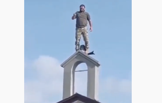 Απίστευτο βίντεο με ισλαμιστη στο Αρτσάχ να έχει ανεβεί πάνω σε εκκλησία κραυγάζοντας ¨Αλλάχ ου Ακμπάρ¨ και άλλα ισλαμιστικά συνθήματα, τα οποία επαναλαμβάνουν οι άλλοι σύντροφοι από κάτω.