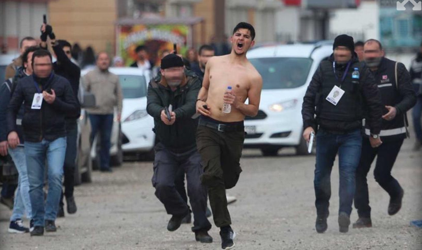 Στην εικόνα εμφανίζεται ο νεαρός Kemal Kurkut, λίγες στιγμές πριν πέσει νεκρός από τους πυροβολισμούς του αστυνομικού που εμφανίζεται πίσω του να τον σημαδεύει με το όπλο.