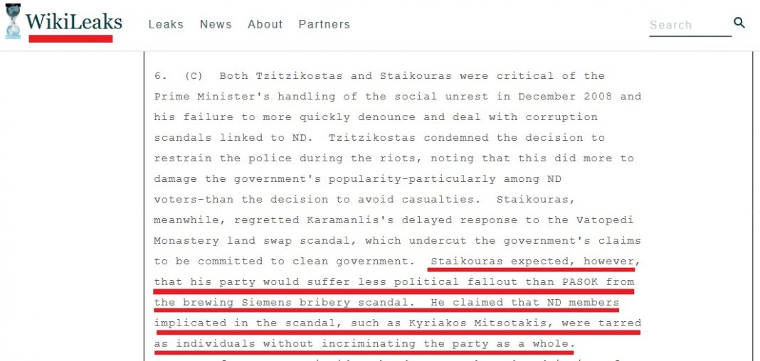 Ιδιαίτερο ενδιαφέρον παρουσιάζουν πάντα σύμφωνα με το wikileaks , οι απόψεις του κ. Σταϊκούρα για το σκάνδαλο Siemens και τον κ.Κυριάκο Μητσοτάκη