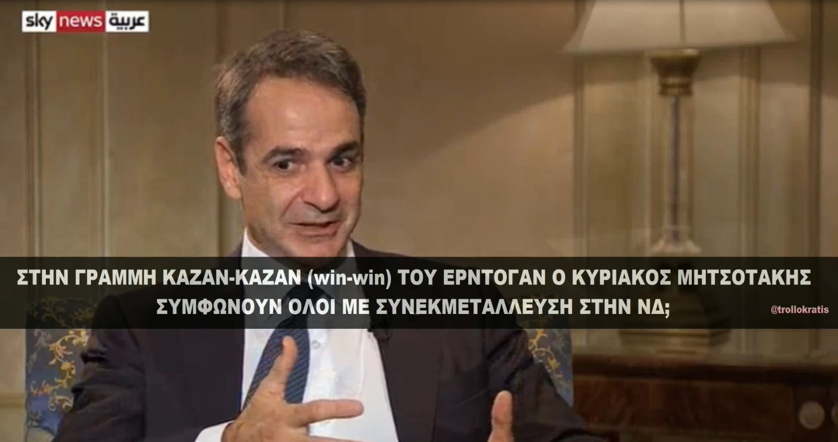 Το πάγιο, από το 2013, αίτημα του Ρετζέπ Ταγίπ Ερντογάν για «καζάν – καζάν» λύση στο Αιγαίο φαίνεται πως αποδέχεται ο Κυριάκος Μητσοτάκης, καθώς χρησιμοποίησε αυτή ακριβώς τη φράση (στα αγγλικά, win – win) σε συνέντευξή του στο τηλεοπτικό δίκτυο Sky News Arabia.