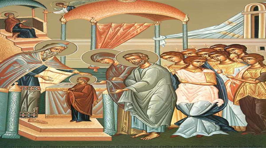 Ή Άννα, μητέρα της Θεοτόκου, επειδή πέρασε όλη σχεδόν τη ζωή της στείρα, χωρίς να γεννήσει παιδί, παρακάλεσε προσευχόμενη το Θεό, μαζί με τον άνδρα της Ιωακείμ, να τους χαρίσει παιδί. Και αν γινόταν αυτό, αμέσως θα το αφιέρωναν στο Θεό. Και πράγματι, ο Θεός ευδόκησε και η Άννα γέννησε την Υπεραγία Θεοτόκο Μαρία. Όταν αυτή έγινε τριών χρονών, την πήραν οι γονείς της και αφιέρωσαν τη θυγατέρα τους στο Θεό, αφού την πήγαν στο Ναό. Την παρέδωσαν στον αρχιερέα Ζαχαρία, ο όποιος αφού την παρέλαβε, την εισήγαγε στα Άγια των Άγιων, όπου μόνο ο αρχιερέας έμπαινε μια φορά το χρόνο. Αλλά ο Ζαχαρίας γνώριζε δι’ αποκαλύψεως τι έμελλε να συμβεί δια της κόρης αυτής. Εκεί η Παρθένος έμεινε δώδεκα χρόνια. Βγήκε τότε, όταν ήλθε η στιγμή να συμβάλει στη σάρκωση του Σωτήρα Χριστού, που είναι “ό άγαπήσας ημάς και δούς παράκλησιν αιωνίαν και ελπίδα άγαθήν εν χάριτι”1. Ο Οποίος, δηλαδή, μας αγάπησε και μας έδωσε παρηγοριά που δε θα έχει τέλος, αλλά θα είναι αιώνια, και μας χάρισε ελπίδα αγαθών ουρανίων.