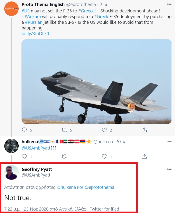 Ο Αμερικανός πρέσβης Τζέφρι Πάιατ διέψευσε κατηγορηματικά μέσω Twitter δημοσίευμα της αγγλόφωνης έκδοσης του “Πρώτου Θέματος”, σύμφωνα με το οποίο, οι Ηνωμένες Πολιτείες δεν θέλουν να πουλήσουν F-35 στην Ελλάδα, από το φόβο μήπως η Τουρκία στραφεί για αγορά νέων μαχητικών -όπως για παράδειγμα Su-57- στη Ρωσία…