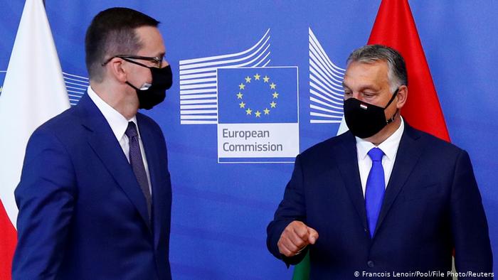 Στον αντίποδα Πολωνία και Ουγγαρία, επιρρίπτουν στην ΕΕ ότι τους τιμωρεί πολιτικά, διότι τηρούν διαφορετική στάση σε ορισμένα μείζονα ζητήματα, όπως είναι το προσφυγικό/μεταναστευτικό. Στο πλαίσιο συνάντησής τους την Δευτέρα οι πρωθυπουργοί των δυο χωρών Μοραβιέτσκι και Όρμπαν υπογράμμισαν τη σθεναρή βούλησή τους να μην μετακινηθούν από τις θέσεις τους και να επιμείνουν στο βέτο, αναμένοντας καταρχάς ενδεχόμενη συμβιβαστική πρόταση της Γερμανικής Προεδρίας.