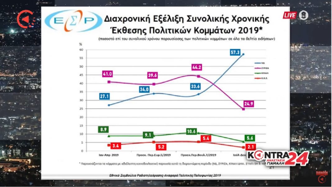 Το Εθνικό Συμβούλιο Ραδιοτηλεόρασης (ΕΣΡ) πως κατανεμήθηκε ο τηλεοπτικός χρόνος των κομμάτων το 2019 στην εκπομπή Kontra24 με την Αναστασία Γιάμαλη.