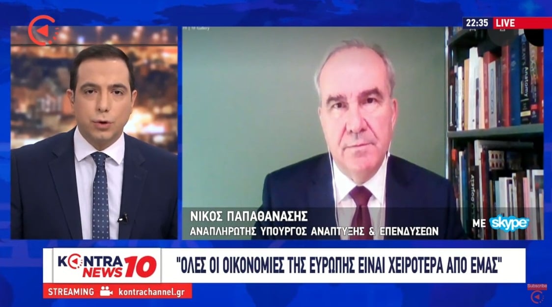O Νίκος Παπαθανάσης Αναπληρωτής Υπουργός Ανάπτυξης και Επενδύσεων αρμόδιος για τις Ιδιωτικές Επενδύσεις και τις ΣΔΙΤ στο δελτίο Kontra News 10 με τον Κωνσταντίνο Μαραβελίδη.