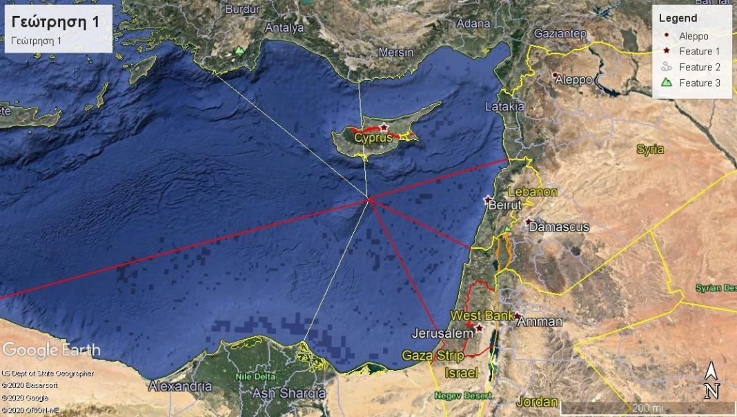 Στον πίνακα 1 δίδονται κατ΄ εκτίμηση οι αποστάσεις από τις γειτονικές χώρες, υπολογίζονται τα δικαιώματα εγγύτητας για κάθε μία και εξαιρούνται αυτές που απέχουν περισσότερο από 200 μίλια, τέλος για τις εγγύτερες υπολογίζονται τα αντίστοιχα μερίδια.Στο συγκεκριμένο παράδειγμα η απόσταση της γεώτρησης από τον Λίβανο και το Ισραήλ συμπίπτει διότι το σύνορο τους είναι το κοντινότερο σημείο και των δύο.Sax 8hΣτον πίνακα 1 βλέπουμε ότι, σύμφωνα με τον κανόνα του δικαιώματος εγγύτητας, η Τουρκία είναι ο τέταρτος κατά σειρά μέτοχος ενώ δημιουργεί την μεγαλύτερη τριβή στην περιοχή έχοντας υπέρμετρες απαιτήσεις .Παράδειγμα 2Στην εικόνα 2 δίδεται σαν παράδειγμα η χωρική απεικόνιση μίας γεώτρησης νοτίως της Κρήτης επί της οποίας διεκδικεί δικαιώματα και η Τουρκία αποκλείοντας την Ελλάδα σύμφωνα με την παράνομη συμφωνία της με την Λιβύη.