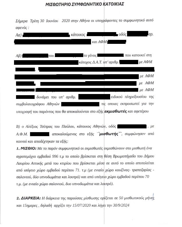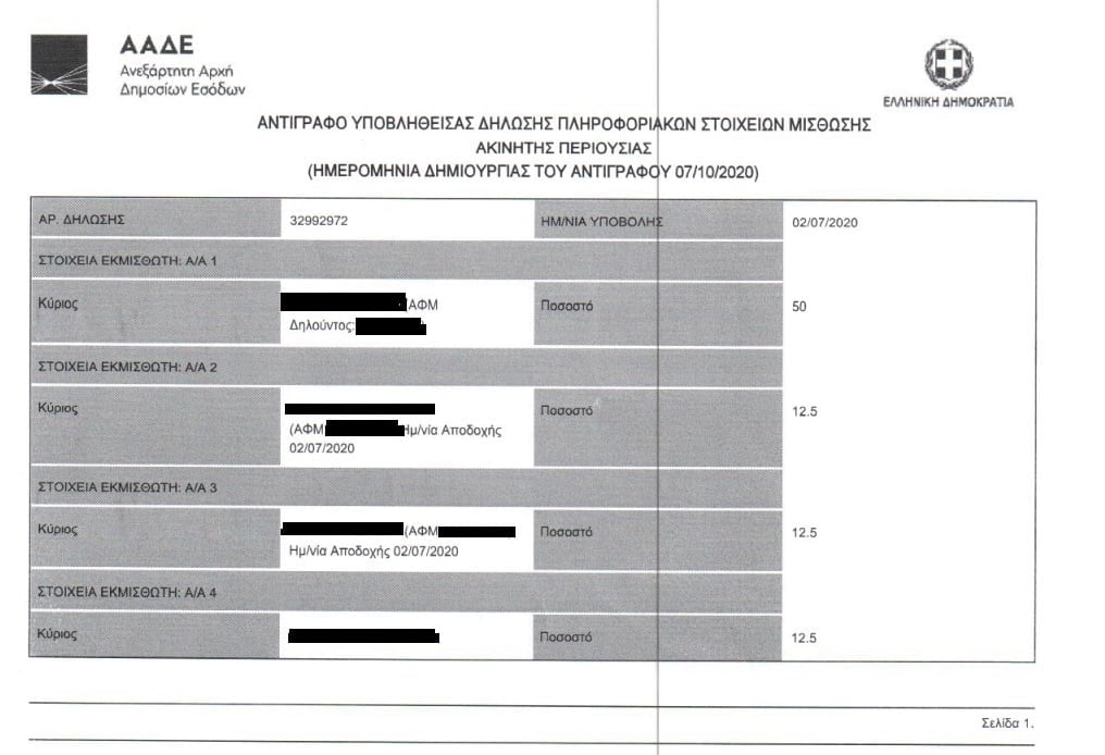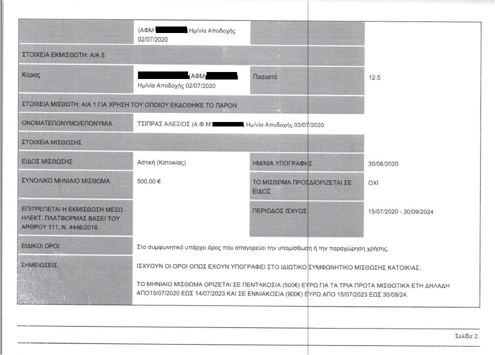 2) Τον Ιούνιο του τρέχοντος έτους υπέγραψα τετραετές μισθωτήριο συμφωνητικό εξοχικής κατοικίας 71 τμ στη περιοχή της Λαυρεωτικής, με αντίστοιχο εμβαδό υπόγειου και με μίσθωμα 500 ευρώ μηνιαίως για τα πρώτα τρία χρόνια και 900 ευρώ μηνιαίως για τον τέταρτο χρόνο. Η συμφωνία περιελάμβανε την προκαταβολική κατάθεση σε τραπεζικό λογαριασμό των μισθωμάτων των τριών πρώτων χρόνων, η οποία και έγινε σε λογαριασμό της ALPHA BANK στις 4 Ιουλίου 2020. Το δε συμφωνητικό κατατέθηκε στην εφορία στις 2 Ιουλίου 2020.