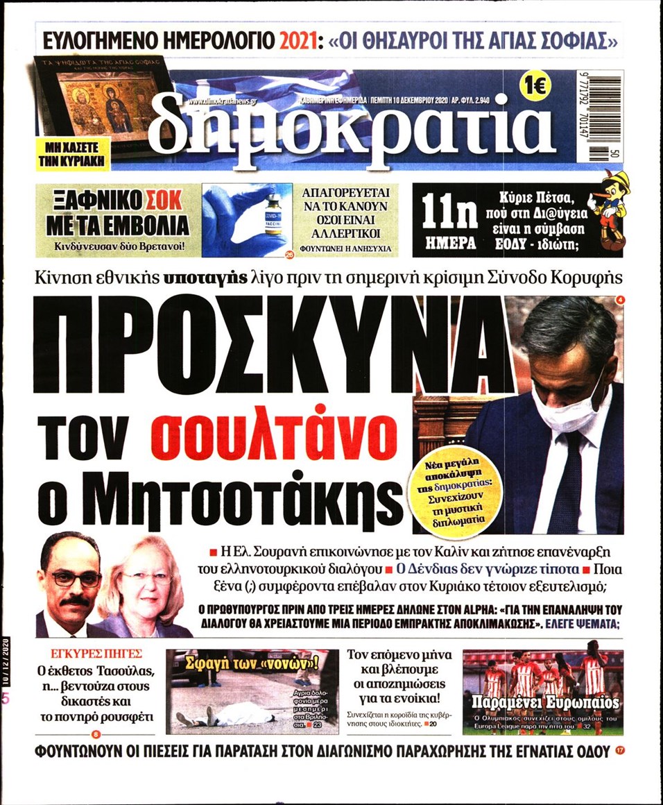 Με ένα αποκαλυπτικό πρωτοσέλιδο και σήμερα η εφημερίδα Δημοκρατία που αφορά την σύνοδο κορυφής, την μυστική διπλωματία και το τι θα γίνει τελικά με τις κυρωσεις για την Τουρκια.