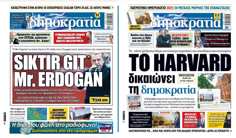 «Στις 18 Σεπτεμβρίου 2020, η εφημερίδα “δημοκρατία” κυκλοφόρησε με τον τίτλο “Siktir Git Mr. Erdogan”. Σε απάντηση, ο Ρετζέπ Ταγίπ Ερντογάν υπέβαλε μήνυση εναντίον των τεσσάρων “εμπλεκόμενων” δημοσιογράφων της εφημερίδας. Η μήνυσή του και ο «αγώνας» από την Ελλάδα και την Ευρώπη να ανταποκριθούν σε αυτή (!!) αποκαλύπτουν τον βαθμό στον οποίο έχει επεκταθεί πια η επιθυμία του Τούρκου προέδρου για πλήρη έλεγχο της δημόσιας εικόνας του πέρα από τα σύνορα της Τουρκίας.