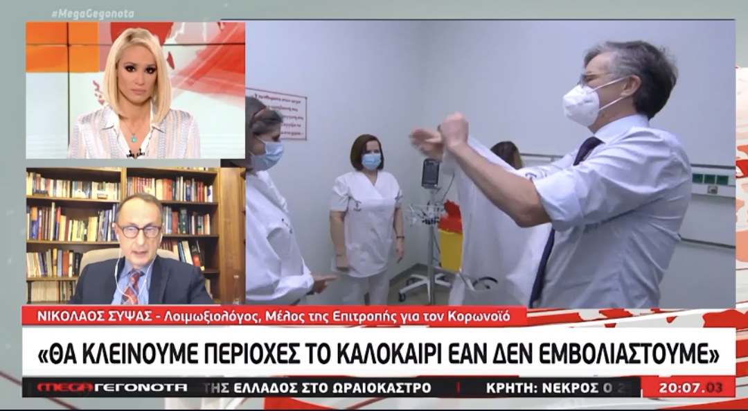 Ο λοιμωξιολόγος και πρόεδρος της επιτροπής εμβολιασμών στο Λαϊκό Νοσοκομείο κ. Σύψας, μιλώντας στο MEGA, πάγωσε τα χαμόγελα και το κλίμα αισιοδοξίας που είχε δημιουργηθεί σήμερα με τους πολιτικούς και λοιπούς επώνυμους να κάνουν το εμβόλιο κατά του κορονοϊού μπροστά στις κάμερες.