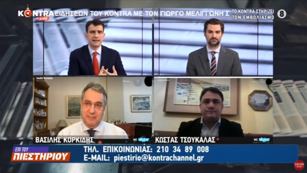 Ο Βασίλης Κορκίδης πρόεδρος του Εμπορικού και Βιομηχανικού επιμελητηρίου Πειραιά κι ο εργατολόγος Κώστας Τσουκαλάς ΕΠΙ ΤΟΥ ΠΙΕΣΤΗΡΙΟΥ με τον Γιώργο Σιαδήμα και τον Αλέξανδρο Κλώσσα