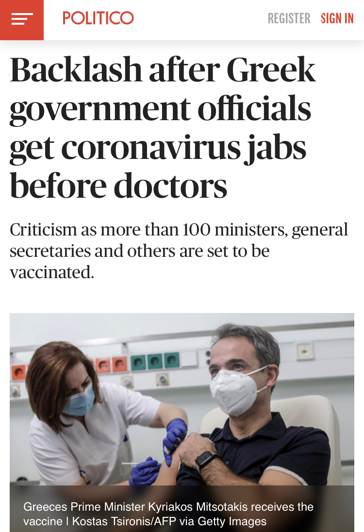 Η κυβέρνηση κατάφερε να διασύρει για άλλη μια φορά τη χώρα γράφοντας πρωτοσέλιδα σε διεθνή μέσα, με το Politico να αναφέρει ότι οι 49 κυβερνητικοί αξιωματούχοι έγιναν ξαφνικά 126 και εμβολιάστηκαν πριν κι από τους υγειονομικούς. Ούτε τα προσχήματα δηλαδή.