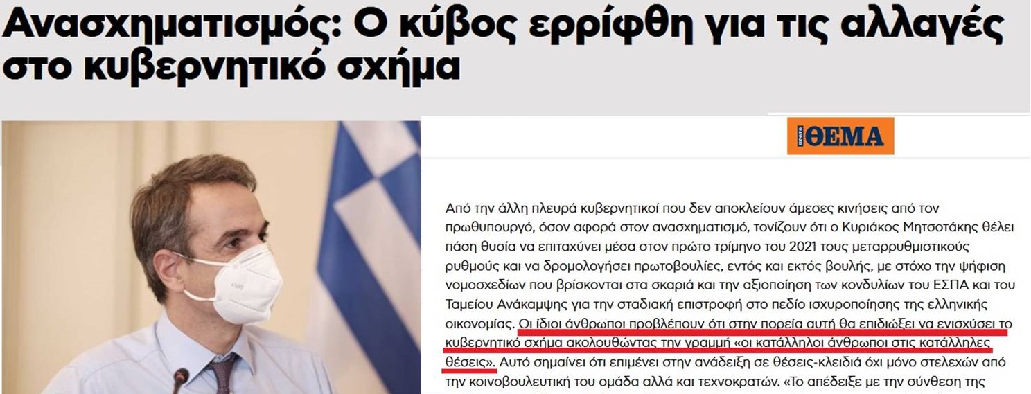 Από την άλλη πλευρά κυβερνητικοί που δεν αποκλείουν άμεσες κινήσεις από τον πρωθυπουργό, όσον αφορά στον ανασχηματισμό, τονίζουν ότι ο Κυριάκος Μητσοτάκης θέλει πάση θυσία να επιταχύνει μέσα στον πρώτο τρίμηνο του 2021 τους μεταρρυθμιστικούς ρυθμούς και να δρομολογήσει πρωτοβουλίες, εντός και εκτός βουλής, με στόχο την ψήφιση νομοσχεδίων που βρίσκονται στα σκαριά και την αξιοποίηση των κονδυλίων του ΕΣΠΑ και του Ταμείου Ανάκαμψης για την σταδιακή επιστροφή στο πεδίο ισχυροποίησης της ελληνικής οικονομίας. Οι ίδιοι άνθρωποι προβλέπουν ότι στην πορεία αυτή θα επιδιώξει να ενισχύσει το κυβερνητικό σχήμα ακολουθώντας την γραμμή «οι κατάλληλοι άνθρωποι στις κατάλληλες θέσεις». Αυτό σημαίνει ότι επιμένει στην ανάδειξη σε θέσεις-κλειδιά όχι μόνο στελεχών από την κοινοβουλευτική του ομάδα αλλά και τεχνοκρατών. (Από το ΠΡΩΤΟ ΘΕΜΑ)