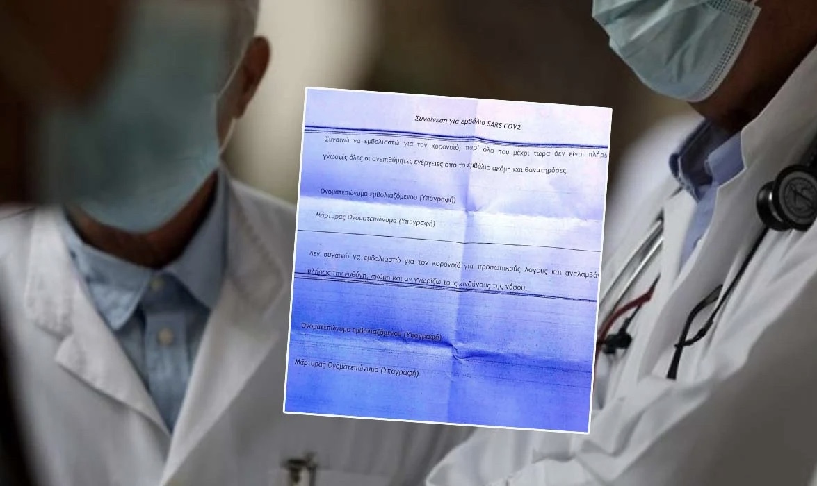 Ο Διοικητής του Νοσοκομείου Καρδίτσας με ένα πρόχειρο έγγραφο με ορθογραφικά μάλιστα λάθη, ζητούσε από τους υγειονομικούς να υπογράψουν χωρίς κάποια επίσημη σφραγίδα, ότι γνωρίζουν πώς το εμβόλιο μπορεί να έχει και θανατηφόρες παρενέργειες.