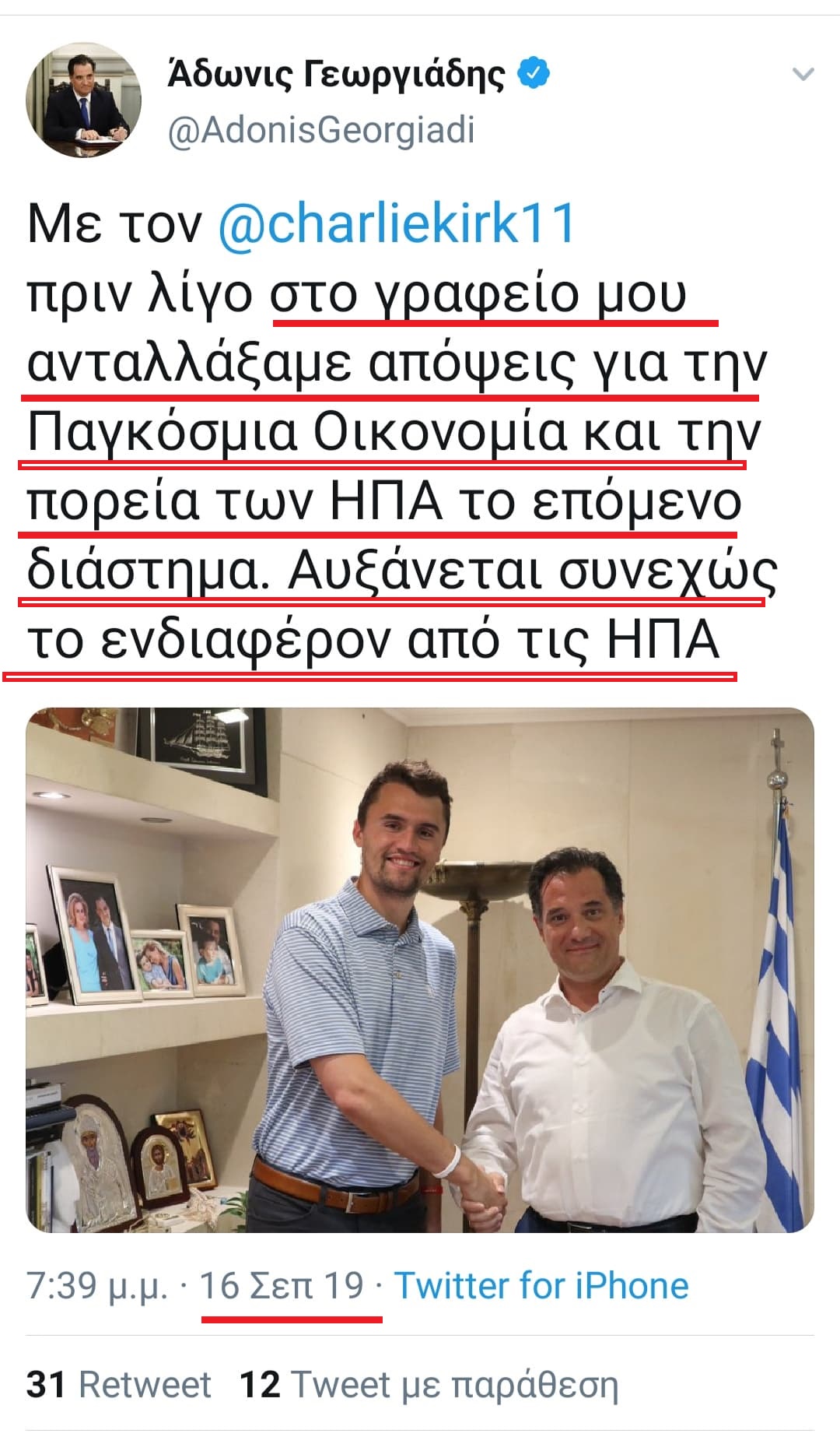 16 Σεπ.2019, όπως βλέπουμε από του τουίτ που ακολουθεί, ο Άδωνις Γεωργιάδης ως Υπουργός Ανάπτυξης και Επενδύσεων είχε συνάντηση στο γραφείο του με τον Charlie Kirk…