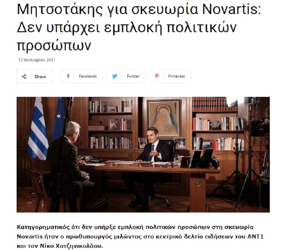 «Ό,τι έλεγα τον Φεβρουάριο του 2018 ισχύει στο ακέραιο και σήμερα. Η χώρα θα διεκδικήσει αυτά τα οποία μπορεί να διεκδικήσει από την Novartis. Υπήρχε σκάνδαλο Novartis. Χρηματισμού γιατρών, υπερσυνταγογράφησης. Δεν υπάρχει καμία αμφιβολία γι’ αυτό. Υπήρχε και ένα δεύτερο, πολιτικό σκάνδαλο Novartis, που είναι το πώς στοχοποιήθηκαν δέκα πολιτικοί από τον ΣΥΡΙΖΑ. Αυτό ερευνάται πια από την Ελληνική Δικαιοσύνη, η οποία και θα αποφανθεί τελικά για τις κατηγορίες οι οποίες έχουν απαγγελθεί, τουλάχιστον σε επίπεδο Βουλής» είπε ο πρωθυπουργός συμπληρώνοντας πως δεν υπήρξαν πολιτικά πρόσωπα στην υπόθεση: «Δεν υπήρξαν. Και θέλω να είμαι απολύτως ξεκάθαρος ότι αυτή η υπόθεση είναι μία υπόθεση η οποία ταλαιπώρησε πάρα πολύ τον δημόσιο διάλογο και νομίζω ότι πια έχουμε μάθει την αλήθεια. Η υπόθεση έχει πάρει την κατεύθυνση την οποία όλοι γνωρίζουμε και ερευνάται και θα ερευνηθεί πια από την Δικαιοσύνη».