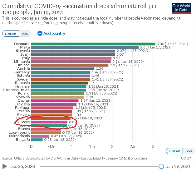 Η χώρα μας βρίσκεται 22η στο σύνολο των 27 χωρών της Ευρωπαϊκής Ένωσης στους εμβολιασμούς κατά του κορονοϊού, σύμφωνα με στοιχεία που δημοσιεύει το ourworldindata.org. Είναι απορίας άξιο μάλιστα πως μια χώρα της οποίας ο πρωθυπουργός έχει θέσει προτεραιότητα το εθνικό σχέδιο εμβολιασμών, βρίσκεται πολύ κάτω από μια χώρα που ακολουθεί αντιεμβολιαστική πολιτική ποντάροντας στην ανοσία της αγέλης, όπως είναι η Σουηδία. Ειδικά μάλιστα όταν ο πρωθυπουργός και σχεδόν το σύνολο των κυβερνητικών στελεχών παρελαύνουν καθημερινά μπροστά από τις οθόνες μας διαφημίζοντας το έργο της κυβέρνησης προτρέποντας τους πολίτες να εμβολιαστούν. Η πραγματικότητα βέβαια είναι πολύ διαφορετική και τους διαψεύδει καθημερινά…