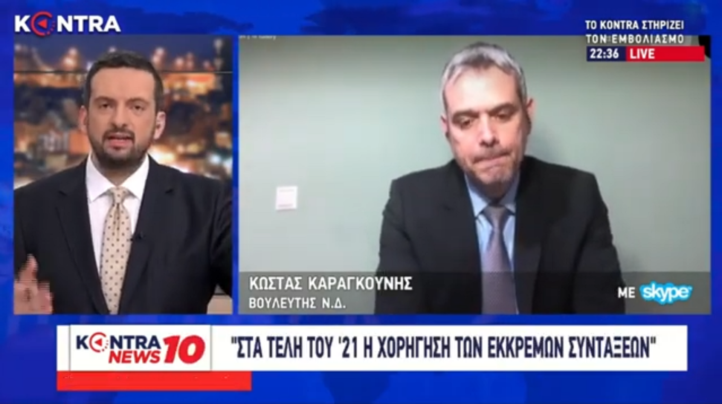 Ο Κώστας Καραγκούνης βουλευτής ΝΔ στο δελτίο Kontra News 10 με τον Γιώργο Μελιγγώνη ότι οι εκκρεμείς συντάξεις θα βγουν στο τέλος του 2021, κάτι που έμμεσα ομολογεί ότι ούτε το 2021 θα τις βγάλουν.