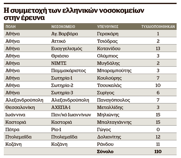 Υπάρχει όµως και χειρότερο. Απαραίτητο στοιχείο για την επιτυχία της µελέτης είναι η συµµετοχή ασθενών. Τους ασθενείς φυσικά βρίσκουν οι γιατροί. Στην GRECCO-19 συµµετείχαν τα πιο επιφανή µέλη της επιτροπής εµπειρογνωµόνων του υπουργείου Υγείας και θα περίµενε κανείς πως θα ήταν εύκολη υπόθεση η ένταξη ασθενών στη µελέτη. Οπως προκύπτει από τα έγγραφα της µελέτης, συµµετείχαν συνολικά 16 νοσοκοµεία στη µελέτη. Θα περίµενε κάποιος πως στα νοσοκοµεία στα οποία υπηρετούν τα µέλη της επιτ-ροπής θα υπήρχε συµµετοχή ασθενών, αφού οι εν λόγω γιατροί έδιναν τη µάχη για την επιτυχία της µελέτης. Η πραγµατικότητα όµως είναι εντελώς διαφορετική. Στη µελέτη συµµετέχουν ασθενείς από περιφερειακά νοσοκοµεία στην επαρχία (Νοσοκοµείο Καστοριάς µε 15 ασθενείς, Πανεπιστηµιακό Νοσοκοµείο Ιωαννίνων µε 15 ασθενείς, Νοσοκοµείο Πτολεµαΐδας µε 11), αλλά τα κεντρικά και µεγάλα νοσοκοµεία της Αττικής, όπου την ευθύνη έχουν οι εµπειρογνώµονες του υπουργείου Υγείας, δεν συµµετέχουν µε ασθενείς. Το νοσοκοµείο Αττικό για παράδειγµα, όπου είναι ο καθηγητής Τσιόδρας, συµµετέχει µε δύο ασθενείς µόνο, ενώ µάλιστα σύµφωνα µε πληροφορίες ήταν σε τέτοια κατάσταση που απεβίωσαν µόλις άρχισε η µελέτη. Ο Ευαγγελισµός, όπου υπηρετεί το µέλος της επιτροπής Αναστασία Κοτανίδου, συµµετέχει παρά το µέγεθός του µε 13 ασθενείς. Εντυπωσιακό είναι πως το Πανεπιστηµιακό Νοσοκοµείο στο Ρίο, στο οποίο υπεύθυνος της µελέτης είναι το µέλος της επιτροπής Χαράλαµπος Γώγος, δεν συνεισφέρει κανέναν ασθενή.