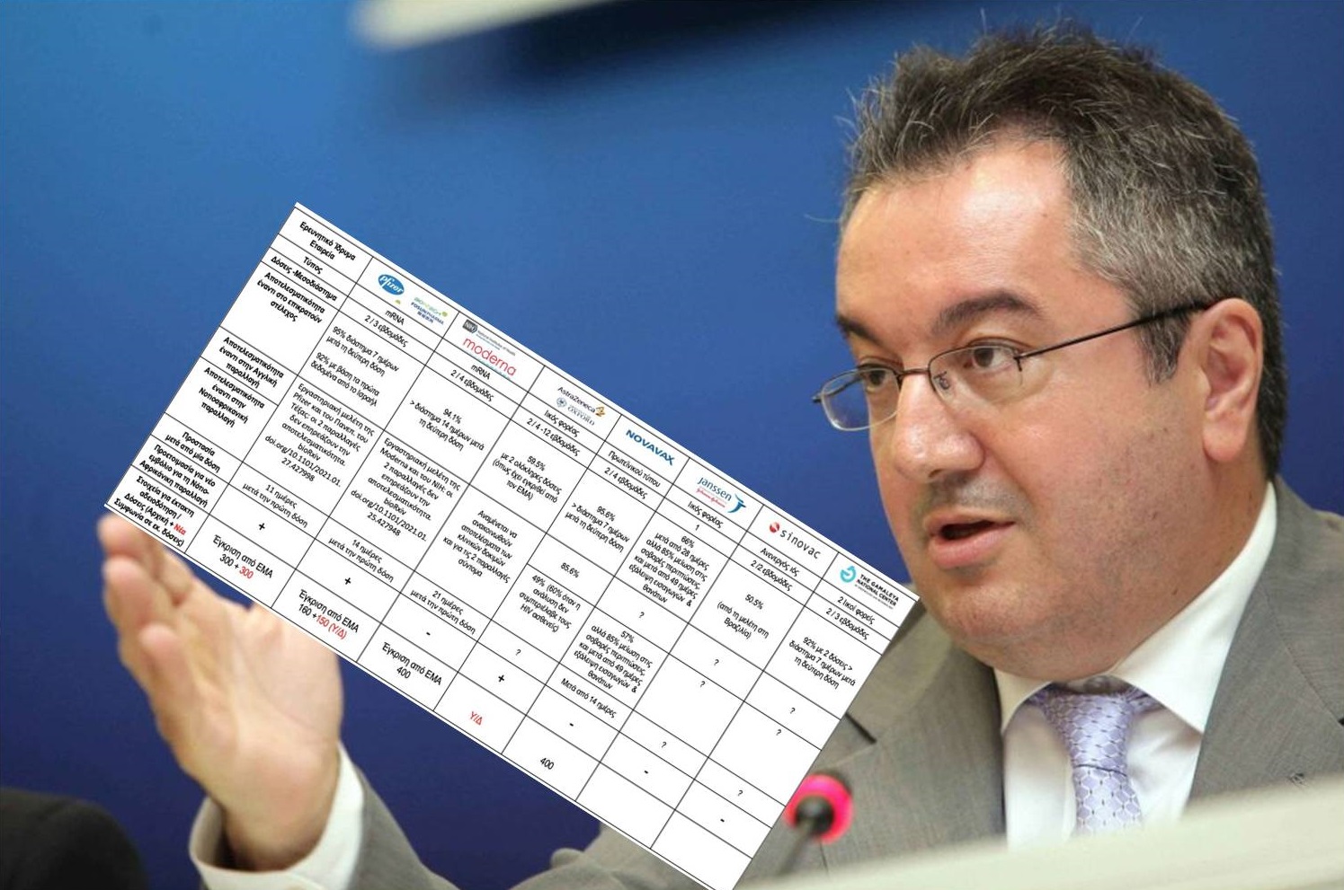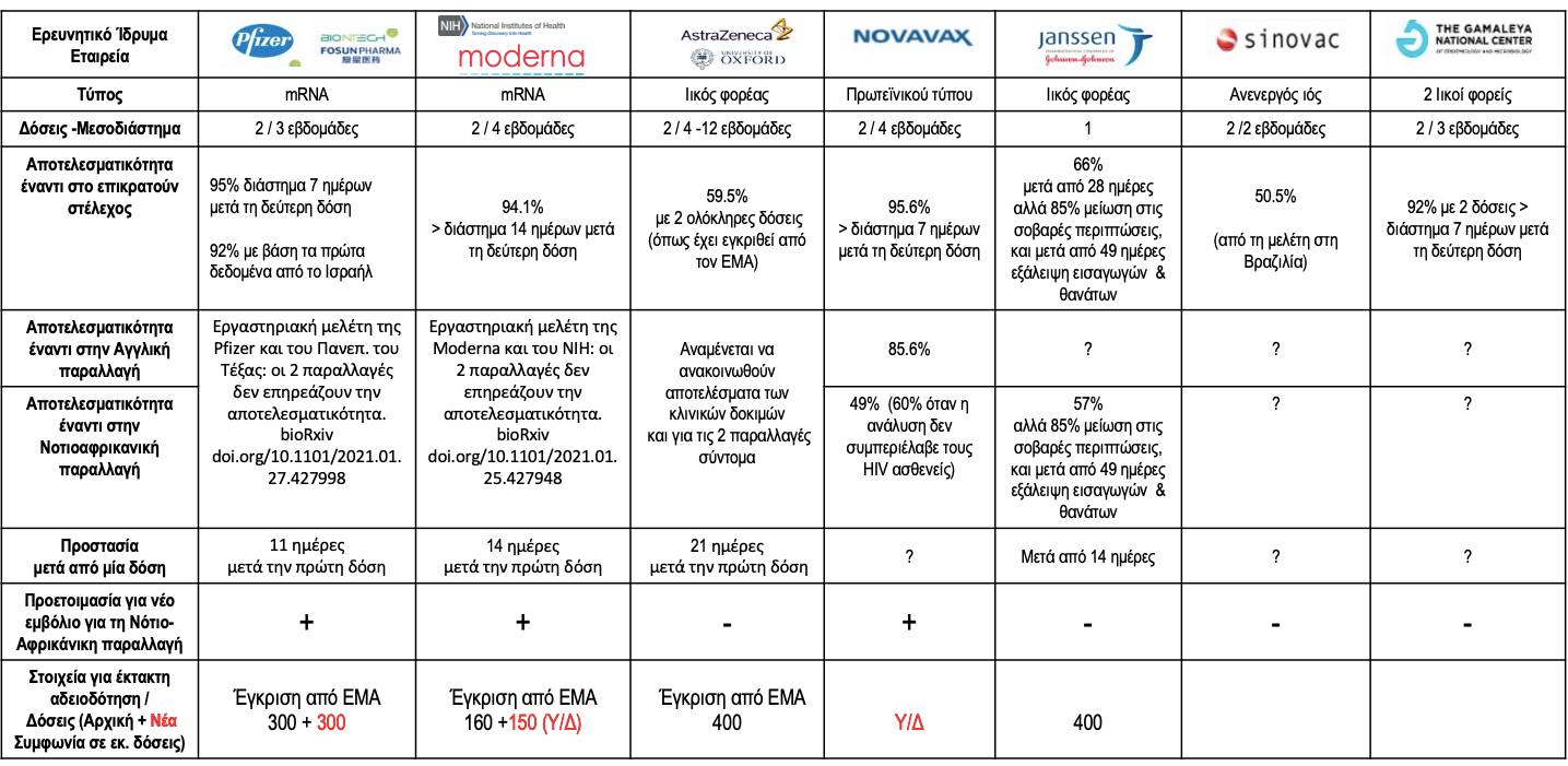Ο κ. Μόσιαλος παρουσιάζει έναν πίνακα με απλή συγκριτική μελέτη των επτά εμβολίων και κάποια στοιχεία για την αποτελεσματικότητα στο επικρατούν στέλεχος και τις δύο σημαντικές παραλλαγές. «Αυτό που προέχει τώρα», όπως λέει, «είναι να αυξηθεί η παραγωγή και η διανομή των εμβολίων, καθώς και ο ρυθμός των εμβολιασμών. Μόνο έτσι θα λήξει η πανδημία».