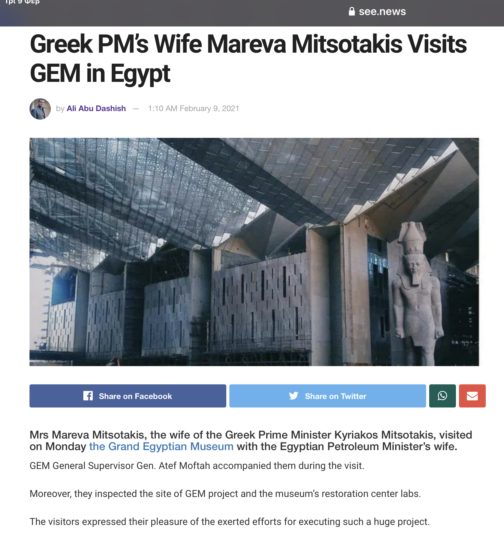 Μετά την παρέμβαση της Μαρέβα Μητσοτάκη, το ένα από τα δύο δημοσιεύματα έχει αποσυρθεί. Άγνωστο γιατί τα αιγυπτιακά μέσα ανέφεραν την παλαιότερη επίσκεψη της συζύγου του πρωθυπουργού Κυριάκου Μητσοτάκη δτα έργα κατασκευής του Μεγάλου Αιγυπτιακού Μουσείου (GEM) που έγινε το 2019, ως σημερινή.