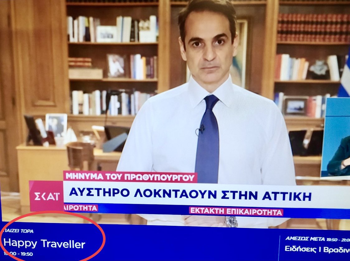 Έτσι ζήσαμε να δούμε να δούμε τον Μητσοτακη να μιλάει και από κάτω να διαβάζουμε στο προγραμμα του σταθμού ότι βλέπουμε τον Happy Traveller.