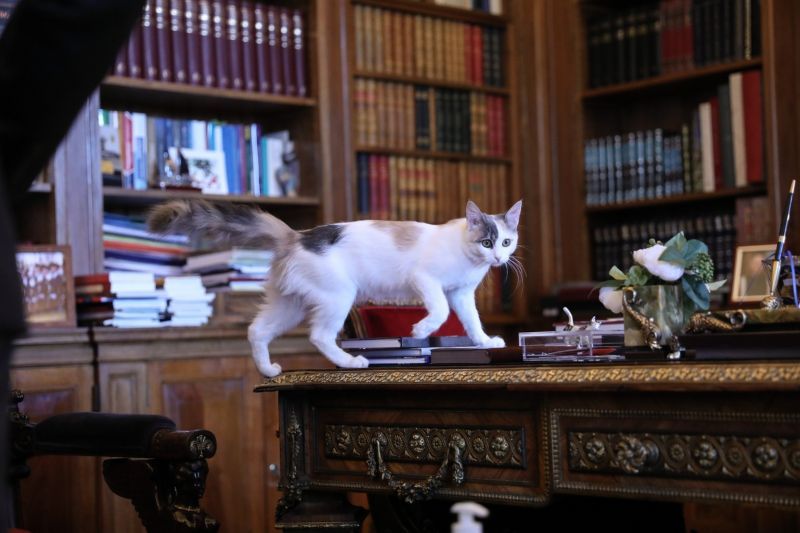 Η επίσημη προεδρική γάτα ήταν στην αρχή διστακτική και στεκόταν ως παρατηρητής της συνάντησης, που είχε η Πρόεδρος της Δημοκρατίας με τον κύριο Παναγιωτόπουλο με αντικείμενο τον… Εθνικό Ύμνο και άλλα συναφή θέματα, αλλά σταδιακά πήρε θάρρος. Πλησίασε τον φιλόζωο Υπουργό Αμύνης, τον περιεργάστηκε, τον οσμίστηκε, έπαιξε μαζί του και αφού έτυχε της απολύτου εγκρίσεως του, επέστρεψε στον θώκο της.