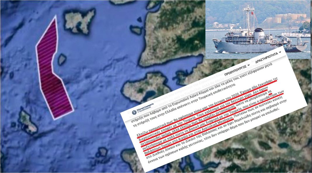 Το τουρκικό υδρογραφικό του πολεμικού ναυτικού βρίσκεται αυτή τη στιγμή μεταξύ Λήμνου και Άη Στρατή. Την ίδια στιγμή λοιπόν που έχουμε σαφέστατη παραβίαση εθνικής κυριαρχίας, ο πρωθυπουργός σε μία επίδειξη ακατανόητης αφέλειας, διότι δεν μπορούμε να θεωρήσουμε ότι συνειδητά προδίδει την Ελλάδα, καλεί την Τουρκία σε διάλογο. Όταν ο ίδιος ο πρωθυπουργός είχε δηλώσει πως δεν μπορεί να υπάρξει διάλογος την ώρα που υφίστανται τουρκικές προκλήσεις. Και αυτή τη στιγμή έχουμε την χειρότερη τουρκική πρόκληση.