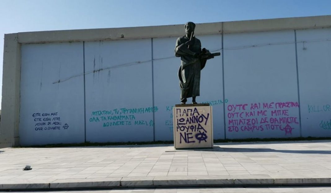 Δεν ήξεραν που να γράψουν και διάλεξαν το άγαλμα του Αριστοτελη; Και τι εγραψαν; Ένα άθλιο υβριστικό σύνθημα κατά του πρύτανη του ΑΠΘ.